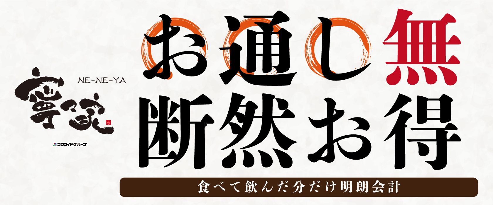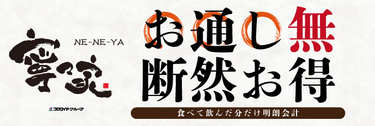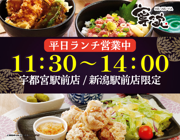 ゆったりくつろげる プライベート空間 まわりを気にしないプライベートな空間。定期的なアルコール消毒で清潔を保ちます。 2026.03.02更新 【宇都宮駅前店・新潟駅前店】月~金曜日限定・ランチスタート!2026.3.2~ 2026.02.02更新 新グランドメニュー登場!2026.2.24~ 2026.01.14更新 『しゃぶしゃぶ食べ放題&飲み放題』のご提供について2026.1.19~ 2025.11.25更新 冬の逸品の数々が登場!2025.11.25~ 2025.06.23更新 冬宴会プランのご案内2025.10.14~ 2024.06.13更新 オススメ【ランチメニューピックアップ】2024.6.17~ 2023.05.29更新 ハッピーアワー実施中!(※店舗により実施日時が異なります)2023.5.29~ お知らせ 2020/04/02 喫煙ブースあります。 2018/01/12 寧々家LINE公式アカウントのご案内 一覧を見る